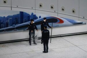 A Chinese police officer stands guard at in the mainland port area of West Kowloon High-Speed Train Station Terminus on the first day of the resumption of rail service to mainland China, during the coronavirus disease (COVID-19) pandemic in Hong Kong, China, January 15, 2023. REUTERS/Tyrone Siu