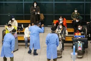 A group of Chinese tourists are led by South Korean soldiers wearing personal protective equipment (PPE) as they wait for coronavirus disease (COVID-19) tests upon their arrival at the Incheon International Airport in Incheon, South Korea, January 4, 2023. REUTERS/Kim Hong-Ji