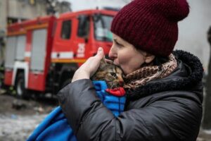 Una mujer local sostiene a su gato rescatado por los equipos de emergencia en el lugar donde un bloque de apartamentos fue fuertemente dañado por un ataque con misiles rusos, durante el ataque de Rusia a Ucrania, en Dnipró, Ucrania, 15 de enero 2023. REUTERS/Yevhenii Zavhorodnii
