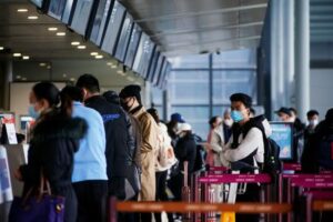 FILE PHOTO: Travellers wearing face masks following the coronavirus disease (COVID-19) outbreak line up at check-in counters of Shanghai Hongqiao International Airport as the Spring Festival travel season begins ahead of the Chinese Lunar New Year, in Shanghai, China January 28, 2021. REUTERS/Aly Song