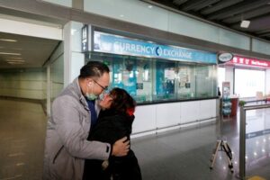 FILE PHOTO: People embrace at the international arrivals gate at Beijing Capital International Airport after China lifted the coronavirus disease (COVID-19) quarantine requirement for inbound travellers in Beijing, China, January 8, 2023. REUTERS/Thomas Peter