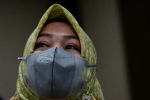 Solihah, 36, the mother of an acute kidney injury (AKI) victim, reacts as she attends a preliminary hearing for a class-action lawsuit filed against the Indonesian government and drug companies for allowing the sale of tainted cough syrup at the court in Jakarta, Indonesia, January 17, 2023. REUTERS/Ajeng Dinar Ulfiana