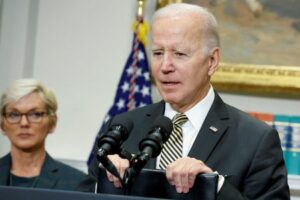 FILE PHOTO: U.S. President Joe Biden, with Energy Secretary Jennifer Granholm, answers questions after his remarks on the national Strategic Petroleum Reserve form the Roosevelt Room at the White House in Washington, U.S. October 19, 2022. REUTERS/Jonathan Ernst/File Photo