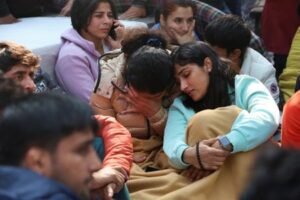 Sakshi Malik and other Indian wrestlers take part in a protest demanding the disbandment of the Wrestling Foundation of India (WFI) and the investigation of its head by the police, who they accuse of sexually harassing female players, at Jantar Mantar in New Delhi, India, January 19, 2023. REUTERS/Anushree Fadnavis