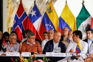 Otty Patino, jefe del equipo negociador del Gobierno colombiano, Danilo Rueda, Alto Comisionado para la Paz de Colombia, Pablo Beltrán, jefe de la guerrilla izquierdista Ejército de Liberación Nacional (ELN) y Aureliano Carbonell negociador del ELN, asisten a una rueda de prensa, anunciando la segunda ronda de conversaciones de paz entre el gobierno de Colombia y el ELN para este año, en Caracas, Venezuela 21 de enero 2023. REUTERS/Leonardo Fernández Viloria
