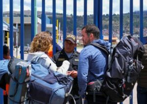 Passengers talk with police outside the airport a day after thousands of demonstrators marched in Lima and in other parts of the country, angered by a mounting death toll since unrest erupted last month and calling for sweeping change, in Cuzco, Peru January 20, 2023. REUTERS/Paul Gambin