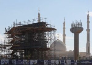 FILE PHOTO: Labourers work on a support column for a monorail line in front of the newly built mosque Al-Fattah Al-Alim near the Central Business District (CBD), which is being built by China State Construction Engineering Corp (CSCEC) in the New Administrative Capital (NAC) east of Cairo, Egypt January 15, 2023. REUTERS/Amr Abdallah Dalsh/File Photo