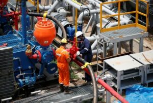 FOTO DE ARCHIVO: Técnicos trabajan en una plataforma petrolífera fabricada por Megha Engineering and Infrastructures Limited (MEIL) en una planta de Oil and Natural Gas Corp (ONGC), durante una visita de los medios de comunicación a la planta en el pueblo de Dhamasna en el estado occidental de Gujarat, India. 26 de agosto, 2021. REUTERS/Amit Dave/Archivo