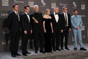 FILE PHOTO: Director Martin McDonagh, cast members and crew of “The Banshees of Inisherin” pose with their award for Best Motion Picture in a Musical or Comedy, at the 80th Annual Golden Globe Awards in Beverly Hills, California, U.S., January 10, 2023. REUTERS/Mario Anzuoni