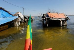 A view of the submerged handicraft market at the Pink Lake (Lac Rose), officially known as Lake Retba after extreme floods washed away salt mounds and contaminated the lake and turned its famous waters from Pink to green, in Niaga, near Dakar, Senegal, January 22, 2023. REUTERS/ Ngouda Dione