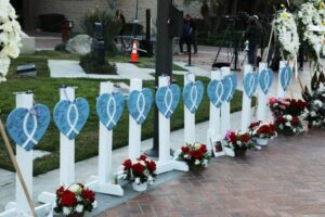 FILE PHOTO: The names of the eleven people killed are written on hearts as people gather for a candlelight vigil after a mass shooting during Chinese Lunar New Year celebrations in Monterey Park, California, U.S. January 24, 2023. REUTERS/David Swanson