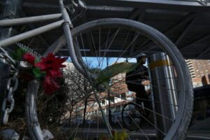 FILE PHOTO: A person rides a bike on the path, where jurors are being asked to vote the death penalty for Sayfullo Saipov for the killing of eight people in his 2017 attack on the Manhattan bike path in New York City, U.S., February 15, 2023. REUTERS/Shannon Stapleton