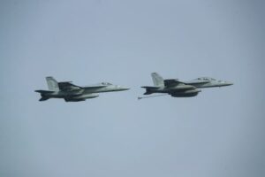 FILE PHOTO: Two F/A-18 Super Hornets assigned to Carrier Air Wing 7 (CVW 7) demonstrate in-flight refueling during an Independence Day air power demonstration above the Nimitz-class aircraft carrier USS Abraham Lincoln (CVN 72), in Arabian Sea, July 4, 2019. Picture taken July 4, 2019. Jeff Sherman/U.S. Navy/Handout via REUTERS