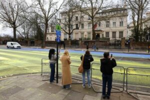 People record images on their phones of a road in the colours of the Ukrainian flag, after Protest group ‘Led by Donkeys’ spread paint on the road, ahead of the first anniversary of Russia’s invasion of Ukraine, outside the Russian Embassy in London, Britain February 23, 2023. REUTERS/Hannah McKay