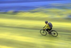 A cyclist rides on a painted road, after Protest group ‘Led by Donkeys’ spread paint in the colours of the Ukrainian flag on the road, ahead of the first anniversary of Russia’s invasion of Ukraine, outside the Russian Embassy in London, Britain February 23, 2023. REUTERS/Hannah McKay TPX IMAGES OF THE DAY