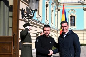 El presidente de Ucrania, Volodímir Zelenski, y el presidente del Gobierno español, Pedro Sánchez, se dan la mano durante una reunión, en medio del ataque de Rusia a Ucrania, en Kiev, Ucrania. 23 de febrero, 2023. Palacio de la Moncloa/Borja Puig de la Bellacasa/Handout via REUTERS. ESTA IMAGEN HA SIDO FACILITADA POR TERCEROS. CRÉDITO OBLIGATORIO.