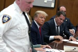 Former U.S. President Donald Trump appears in court for an arraignment on charges stemming from his indictment by a Manhattan grand jury following a probe into hush money paid to porn star Stormy Daniels, in New York City, U.S., April 4, 2023. REUTERS/Timothy A. Clary/Pool
