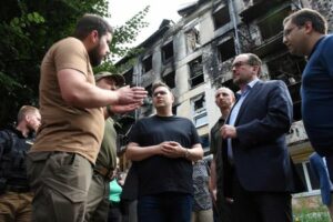 FILE PHOTO: Austria’s Foreign Minister Alexander Schallenberg and his Czech Republic’s counterpart Jan Lipavsky visit the settlement of Hostomel heavily damaged during Russia’s attack on Ukraine, outside of Kyiv, Ukraine July 20, 2022. Press service of the Foreign Ministry of Ukraine/Handout via REUTERS