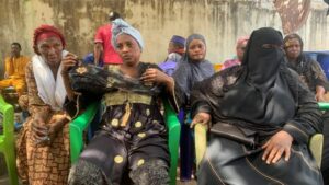 Mariame Diallo, the mother of Boubacar Diallo, 17, who was killed during the May clashes between demonstrators and security forces, gestures while she is surrounded by relatives and friends who came to support her in Conakry, Guinea May 11, 2023. REUTERS/Souleymane Camara