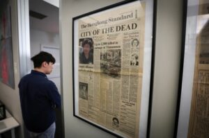 Hong Kong Newspapers from June 5, 1989, reporting the Tiananmen Square China uprising, is pictured during a press preview of the Tiananmen June 4th Memorial permanent exhibition, which opens June 2 in Manhattan, in New York City, U.S., June 1, 2023. REUTERS/Mike Segar