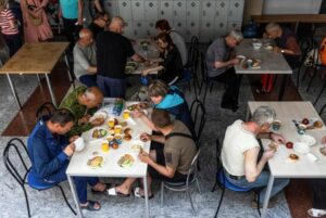 Residents of the Shebekinsky district of Russia’s Belgorod region, who were evacuated following recent attacks on settlements near the Russia-Ukraine border in the course of a military conflict, have meals at a temporary accommodation centre located in a sports facility in the city of Belgorod, Russia, June 7, 2023. REUTERS/Maxim Shemetov