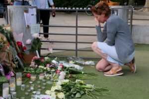 A woman pays respect in front of messages and floral tributes at the children’s playground the day after several children and adults were injured in a knife attack at the Le Paquier park near the lake in Annecy, in the French Alps, France, June 9, 2023. REUTERS/Denis Balibouse