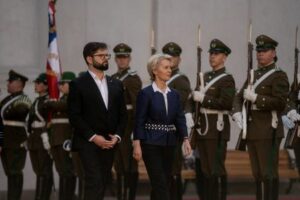 El presidente de Chile, Gabriel Boric, y la presidenta de la Comisión Europea, Úrsula von der Leyen, pasan junto a una guardia de honor reunidos en el palacio de gobierno de La Moneda en Santiago, Chile, el 14 de junio de 2023. Palacio Presidencial/Handout via REUTERS. ESTA IMAGEN HA SIDO SUMINISTRADA POR UN TERCERO. NO REVENTAS. SIN ARCHIVOS