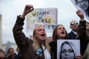 Gabriela Nowina-Witkowska, de 16 años, y Ewa Wloczynska, de 16, participan en una protesta, después de que una mujer embarazada murió en el hospital en un incidente que los activistas dicen que es culpa de las leyes polacas sobre el aborto, que son algunas de las más restrictivas de Europa, en Varsovia, Polonia. 14 de junio 2023. REUTERS/Kacper Pempel