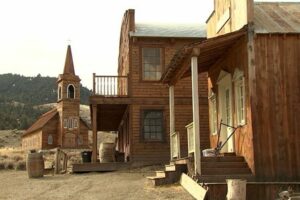 FILE PHOTO: Buildings used on the set of the movie “Rust” are seen near a chapel which will not be used, on the first day that filming resumed after the 2021 shooting death in New Mexico of cinematographer Halyna Hutchins, in Livingston, Montana, U.S. April 21, 2023 in a still image from video. REUTERS/Sandra Stojanovic/File Photo