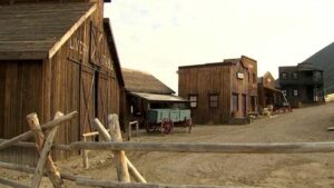 FILE PHOTO: Buildings used on the set of the movie “Rust” are seen on the first day that filming resumed after the 2021 shooting death in New Mexico of cinematographer Halyna Hutchins, in Livingston, Montana, U.S. April 21, 2023 in a still image from video. REUTERS/Sandra Stojanovic/File Photo