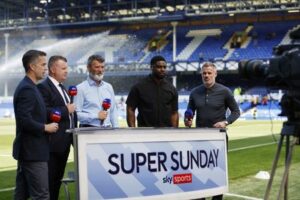 FILE PHOTO: Soccer Football – Premier League – Everton v AFC Bournemouth – Goodison Park, Liverpool, Britain – May 28, 2023 TV presenter David Jones with pundits Micah Richards, Roy Keane and Jamie Carragher and former Everton player Graham Stuart ahead of the match Action Images via Reuters/Jason Cairnduff/File Photo