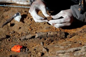 Un paleontólogo revisa huesos fosilizados del ‘Gonkoken nanoi’, un dinosaurio de pico de pato recientemente identificado, que habitó la zona patagónica chilena, en El valle del río de las Chinas, cerca de Torres del Paine, región de Magallanes y Antártica, Chile, en esta foto sin fecha obtenida por Reuters el 15 de junio de 2023. Universidad de Chile/Handout via REUTERS ESTA IMAGEN HA SIDO SUMINISTRADA POR TERCEROS. CRÉDITO OBLIGATORIO. NO DISPONIBLE PARA REVENTAS. NO DISPONIBLE PARA ARCHIVO.
