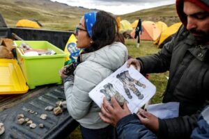 Paleontólogos trabajan en el lugar donde se hallaron los huesos fosilizados del ‘Gonkoken nanoi’, un dinosaurio de pico de pato recientemente identificado, que habitó la zona patagónica chilena, El valle del río de las Chinas, cerca de Torres del Paine, región de Magallanes y Antártica, Chile, en esta foto sin fecha obtenida por Reuters el 15 de junio de 2023. Universidad de Chile/Handout via REUTERS ESTA IMAGEN HA SIDO SUMINISTRADA POR TERCEROS. CRÉDITO OBLIGATORIO. NO DISPONIBLE PARA REVENTAS. NO DISPONIBLE PARA ARCHIVO.