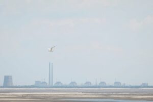 View shows a water level in Kakhovka reservoir, which sharply dropped, after Kakhovka dam destruction, on the background of Zaporizhzhia Nuclear Power Plant, amid Russia’s attack on Ukraine, in Nikopol, Dnipropetrovsk region, Ukraine June 16, 2023. REUTERS/Alina Smutko