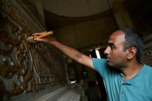 Hossam Abdel-Azim, founder of Witness for Egypt, who is volunteering in a conservation plan to clean up historic cemeteries once they are demolished due to a new construction project underway on the Salah Salem road, works in the capital city of Cairo, Egypt, May 27, 2023. REUTERS/Hadeer Mahmoud