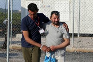 Egyptian survivor Atia Al Said, 22, who was rescued with other refugees and migrants at open sea off Greece after their boat capsized, reunites with his uncle Mohamed El Sayed El-Dadamony Radwan, 54, inside a reception and identification camp in Malakasa, Greece, June 18, 2023. REUTERS/Stelios Misinas