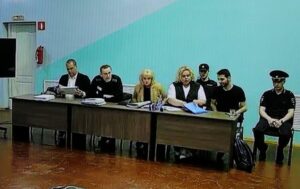 Russian opposition politician Alexei Navalny, his lawyers Olga Mikhailova and Vadim Kobzev and other participants are seen on a screen via a video link during an external hearing of the Moscow City Court in a new criminal case against Navalny on numerous charges, including the creation of an extremist organization, at IK-6 penal colony in the Vladimir region, Russia, June 19, 2023. REUTERS/Evgenia Novozhenina