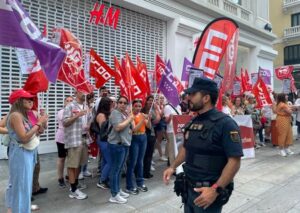 People take part in a protest in front of an H&M store as shop assistants working for the Swedish fashion retailer kick off a three day strike to demand higher salaries and workload reduction, in Madrid, Spain, June 20, 2023. REUTERS/Corina Rodriguez