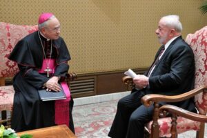 Brazil’s President Luiz Inacio Lula da Silva talks with appointed Substitute for General Affairs of the Vatican’s Secretariat of State Archbishop Edgar Pena Parra, during this meeting with Pope Francis, at the Vatican, June 21, 2023. Vatican Media/Handout via REUTERS