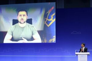 British Prime Minister Rishi Sunak applauds as Ukraine’s President Volodymyr Zelenskiy appears on the screen at the opening session on the first day of the Ukraine Recovery Conference in London, Britain June 21, 2023. Leaders and representatives from more than 60 countries are in London for a two-day conference to secure funding to help Ukraine recover from the ravages of war. Henry Nicholls/Pool via REUTERS