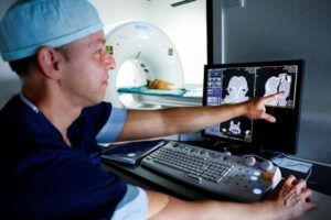 French bulldog Abbey undergoes a CT-scan for her breathing problems while the Dutch government proposes a law banning the possession of cats and dogs with characteristics such as too-short snouts which animal rights activists say are cruel in Utrecht, Netherlands June 20, 2023. REUTERS/Piroschka van de Wouw