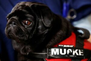 Pug Mupke waits for a check into the cause of breathing problems at a veterinary clinic while the Dutch government proposes a law banning the possession of cats and dogs with characteristics such as too-short snouts which animal rights activists say are cruel in Utrecht, Netherlands June 20, 2023. REUTERS/Piroschka van de Wouw