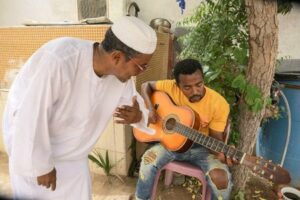 El Safi Mahdi, Sudanese music professor enjoys next to his friend playing guitar, as he waits to travel to his Sudanese musician wife Sohair Saddig Ali, who fled the fighting following the crisis, at the theatre of Novelists and Artists Union in the city of Port Sudan, Sudan, June 16, 2023. REUTERS/Ibrahim Mohammed Ishak