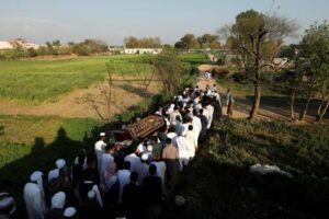 People carry the coffin of Muhammad Ali, 21, who along with others died when a migrant boat shipwrecked off the coast near Benghazi in Libya, during his funeral at a graveyard in Bhojpur town in Gujrat district of Punjab province, Pakistan March 7, 2023. REUTERS/Akhtar Soomro