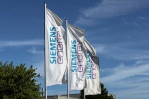 FILE PHOTO: Flags are seen at Siemens Energy’s site on the day of German Chancellor OIaf Scholz’s visit, during which he saw a gas turbine meant to be transported to the compressor station of the Nord Stream 1 gas pipeline in Russia, in Muelheim an der Ruhr, Germany, August 3, 2022. REUTERS/Wolfgang Rattay/FILE PHOTO