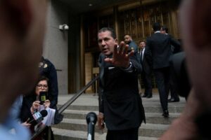 FILE PHOTO: Joe Tacopina, lawyer of former U.S. President Donald Trump, gestures to reporters outside the Manhattan Federal Court following the verdict in the civil rape accusation case against former U.S. President Donald Trump, in New York City, U.S., May 9, 2023. REUTERS/David Dee Delgado/File Photo