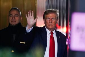 Der ehemalige US-Präsident Donald Trump gestikuliert, während er vor dem Trump Tower zu einer Gerichtsanhörung geht, bei der es um den Vorwurf geht, Geschäftsunterlagen gefälscht zu haben, um eine Schweigegeldzahlung an einen Pornostar vor der Wahl 2016 zu vertuschen, in New York City, USA, 15. Februar 2024. REUTERS/Bing Guan