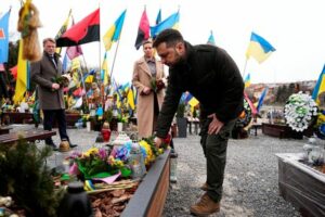 Ukrainian President Volodymyr Zelenskiy lays a wreath alongside Denmark’s Prime Minister Mette Frederiksen, and her husband Bo Tengberg during a memorial ceremony at the Field of Mars at Lychakiv Cemetery in Lviv, Ukraine Friday February 23, 2024. Ritzau Scanpix/via REUTERS