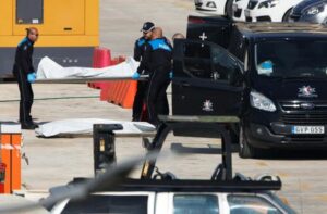 Police officers carry the body of a drowned migrant into a hearse, after a boat carrying 30 migrants capsized during a rescue operation off Malta, at the Armed Forces of Malta maritime squadron base at Haywharf in Valletta’s Marsamxett Harbour, Malta February 23, 2024. REUTERS/Darrin Zammit Lupi