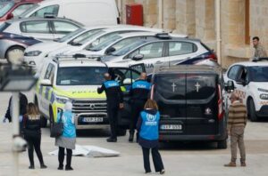 A parked hearse stands next to police forensic officers gathering next to the body of a drowned migrant after a boat carrying 30 migrants capsized during a rescue operation off Malta, at the Armed Forces of Malta maritime squadron base at Haywharf in Valletta’s Marsamxett Harbour, Malta February 23, 2024. REUTERS/Darrin Zammit Lupi